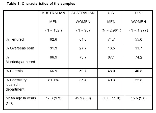 Characteristics of the samples. Table 1 presents selected demographic characteristics of the two samples broken down by gender. Of the 5,075 U.S. respondents, 39.0% were women, 58.3% men, and 2.7% of undisclosed gender. Of the 232 Australian respondents, 41.4% were women, 56.9% were men, and 1.7% of undisclosed gender. Less than one-quarter of the U.S. women and just over a third of the Australian women were located in Chemistry departments. Although not shown in the Table, in the U.S. sample, women comprised 23.6% of respondents in Chemistry and 50.4% of respondents in English. The corresponding figures for the Australian sample were 24.1% and 71.3%, respectively. Males are slightly older than women in both samples. In both samples, men are more likely to: hold tenure, be parents, and be married or partnered. Australian men had the highest proportion of tenure (82.6%) and U.S. women the lowest (55.0%). Higher rates of parenting were found in the Australian sample, ranging from 40.8% for U.S. women to 66.9% for Australian men.