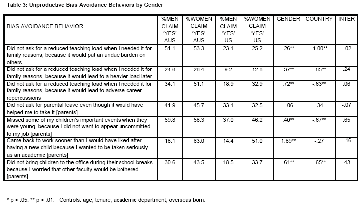This study analyses bias avoidance behaviors, which arise when individuals minimize or hide family commitments to achieve career success. Two types of bias avoidance behaviors are identified. “Productive” avoidance behaviors occur when caregiving commitments are sacrificed in order to improve work performance and meet the ideal worker norm. “Unproductive” bias avoidance behaviors are behaviors that involve hiding or covering up caregiving commitments, regardless of work performance, to enhance the appearance of being an ideal worker. Using data from Chemistry and English faculty from U.S. and Australian colleges and universities this study addresses three questions.