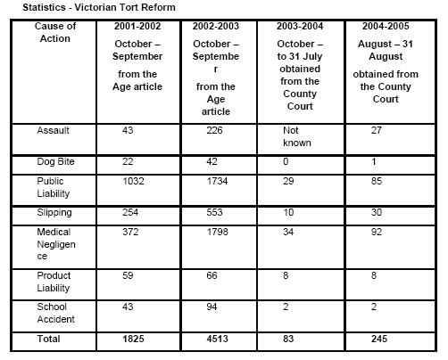 For the purposes of this analysis, whilst column 2 shows the "spike" in claims, I consider it is more indicative to compare columns 1 and 4. In this regard, the total number of public liability and slipping cases in the period 2001/2002 (prior to the Tort Reforms) totalled 1,286 cases. After the Tort Reform, in 2004/2005 the total number of public liability and slipping cases totalled 115. This effectively represents a 91% reduction in claims. In 2001/2002 there were 372 claims involving medical negligence. In Column 4 in 2004/2005 there were 92 which represents about a 75% reduction in the number of medical negligence claims issued.